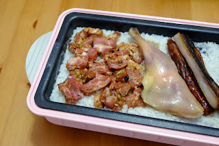 4. 當水份收乾得差不多,平鋪上豉椒排骨、臘鴨、臘腸和臘肉,加蓋中小火煮12分鐘。