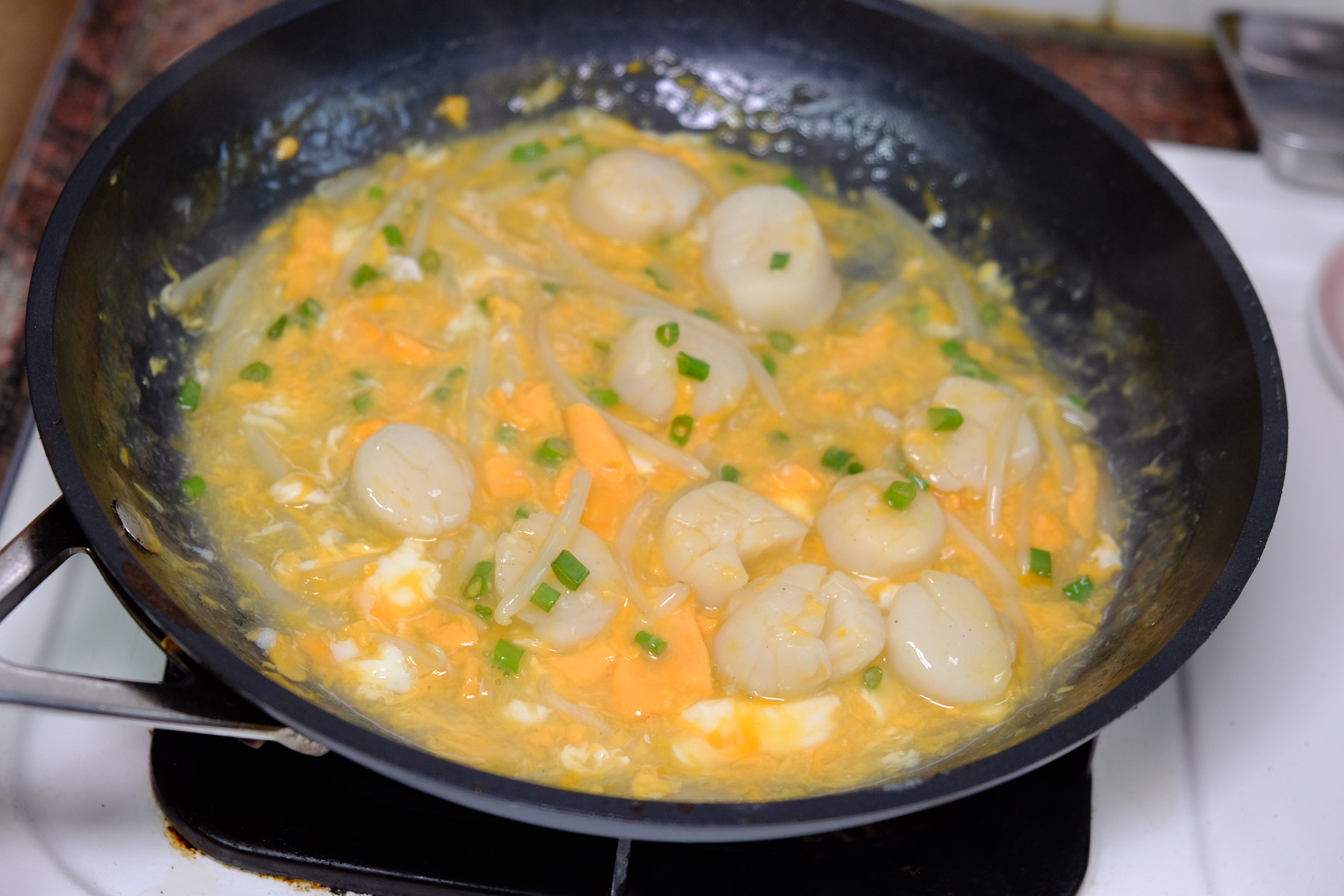 4. 同一鑊中下少許油,在鑊的一邊加入帶子中火煎至兩面上色,不用全熟,盛起,另一邊加入銀芽炒至半熟,盛起。
